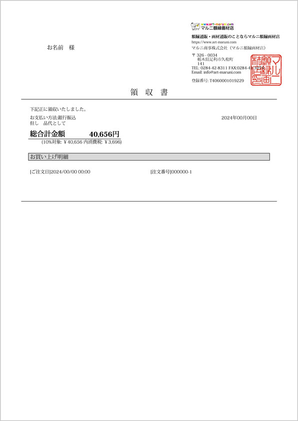 お支払いは下記の方法よりお選びいただけます。 【振込み】 ご入金確認後の商品手配(制作・取寄せ・発送)となります。 ※納期のご連絡後、2週間以内にご入金をお願いいたします。 期日までに入金の確認ができない場合は、誠に恐縮ながらキャンセルとさせていただきますので、あらかじめご了承ください。 期限内でのお振込みが難しい場合は、お早めにご連絡・ご相談ください *お急ぎの場合はご相談ください。電話:0284-42-8311 ・みずほ銀行 足利支店 普通預金 1585020 マルニ商事株式会社 ※振込手数料はお客様ご負担となります。 ・ 郵便振込 記号:10710 番号:31790901 口座名称:マルニ商事株式会社 ※振込手数料はお客様ご負担となります。 ※上記内容でお振込みできない場合は、窓口にてお問い合わせください。 ※振込みの際の依頼人名はご注文者様のお名前でお願いします。 【代金引替】※代引きでのお支払いは現金のみです。(上限30万) 配達時に、配達員(ヤマト運輸、郵便局、その他運送会社)に、代金を現金にてお支払いいただきます。 ※お支払いの総額は、商品代金+消費税+送料+代引手数料となります。 ※手数料:ご購入金額(送料含む)により ~9,999円まで:330円 ~29,999円まで:440円 ~99,999円まで:660円 ~300,000円まで:1,100円 【コンビニ支払】 ご注文時にお選びいただいたコンビニエンスストアでお支払ください。ご入金後発送となります。 ※ご注文完了後の内容変更・追加ご注文はお承り出来ません。 ※ご注文後1週間以内にお振込みをお願いします。期間が過ぎますと自動的にキャンセルとなりますのでご注意ください。 ※手数料300円がかかります。 (ローソン・ファミリーマート・サークルKサンクス・ミニストップ・デイリーヤマザキ・セブンイレブン・セイコーマート・スリーエフ) 【カード(VIZA/MASTER/AMEX/JCB/Diners)】 お手持ちのクレジットカードにてお支払いいただきます。 情報を暗号化する技術(SSL)を採用しておりますので、安心してご利用いただけます。 ※カード決済は、インターネットでの注文のみご利用いただけます。 ※お支払いの総額は、 商品金額+消費税+送料となります。手数料はかかりません。 ※ご利用いただけるカードは、下記からお選びいただけます。 お支払回数は「一括払い」「分割2回払い」のみです。 ![]() ※2025年2月27日より本人認証サービス「3Dセキュア2.0」を導入致しました。 詳細はこちらよりご確認下さい 【後払い】 ヤマトクレジットファイナンス株式会社の後払い決済サービスにてお支払い頂きます。 商品お届け後、支払用の封書がお手元に届きますので、 お近くのコンビニエンスストア・郵便局にてお支払ください。 ※手数料300円がかかります。 ※ご注文完了後の追加ご注文はお承り出来ません。 ※1か月の上限金額は55,000円(税込)となります。 ※請求書発効日から14日以内にお支払いください。 【領収書に関するご案内】 お支払い方法ごとの領収書の発行について。