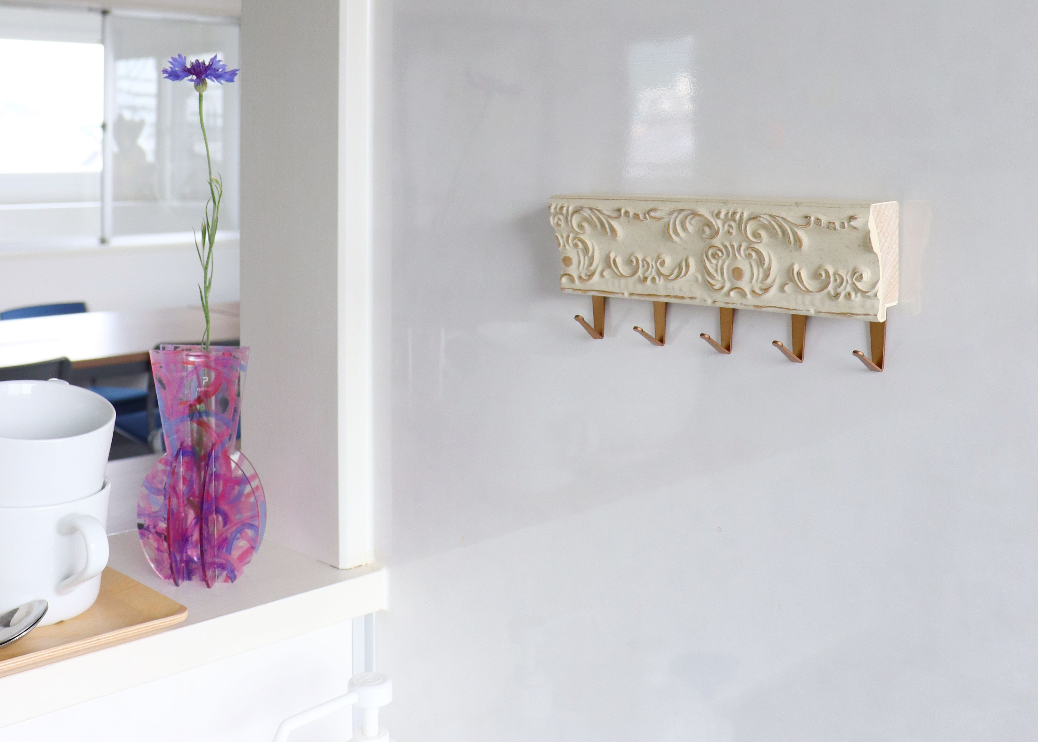 切り出す工程で少しだけ残ってしまう端材を活用して生まれたのが、額縁ならではの装飾性を活かしたキーフックです。