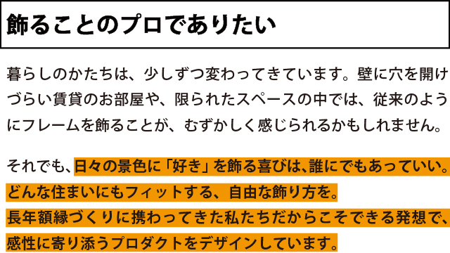 長年額縁づくりに携わってきた私たちだからこそできる発想で、感性に寄り添うプロダクトをデザインしています。