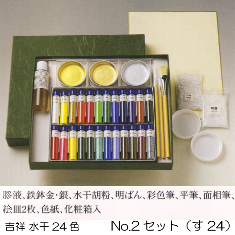 水干24色、膠液、筆3本、絵皿、色紙などが組まれたセット。