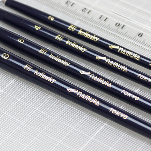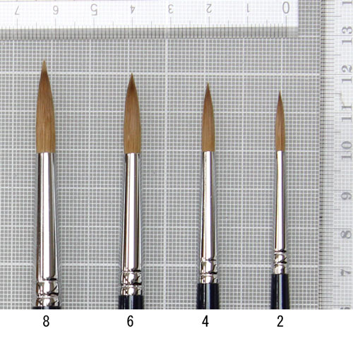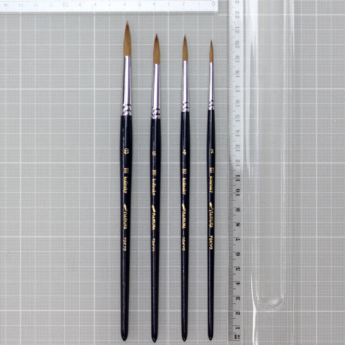 特選ヨーロッパ製コリンスキーを使用した最高級水彩筆です。サイズは4種 2,4,6,8号。2号、4号は繊細な部分、ライン描写用として細めに仕上げてあり、6号、8号は彩色、面塗り用に先の毛量を多くし絵具の伸びがよくなるようにしました。軸色は、ゆったりと落ち着いて描けるようにインド藍色を採用しました。