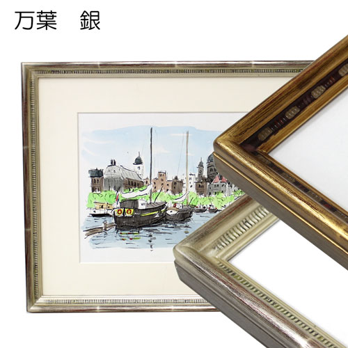 「万葉」はフレーム幅:23mmの額縁です。渋めの色合いとフレーム内側の模様が作品をおしゃれに演出します。水彩画、パステル画、写真など幅広い作品に対応可能です。