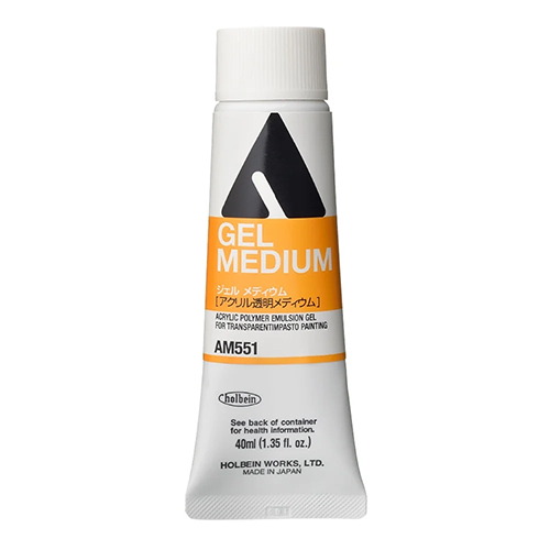 アクリル画の透明感のある盛り上げができます。色ガラスのような厚みのある表現ができ、コラージュ技法の接着剤としても使えます。
