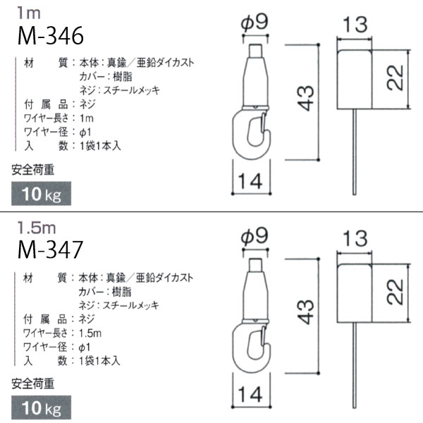 ◎M-347(1.5m・Φ1):安全荷重:10Kg、1個入/袋、木ネジ付