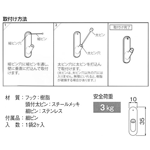 ◎M-027(ホワイト):安全荷重:3Kg、2個入/袋、ピン付
