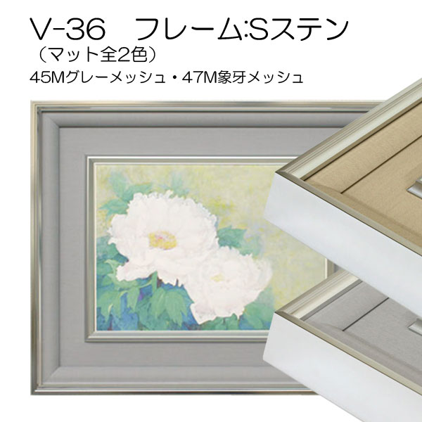 アルミ製の日本画額縁:V-36は、古風ですっきりしたイメージです。スタイリッシュな形状のアルミ額縁に、布地の落ち着いたマット(45Mグレーメッシュ/47M象牙メッシュ )が作品を引き立てます!アルフレームV36が、水彩画、水墨画、その他作品を格式高く引き立てます。