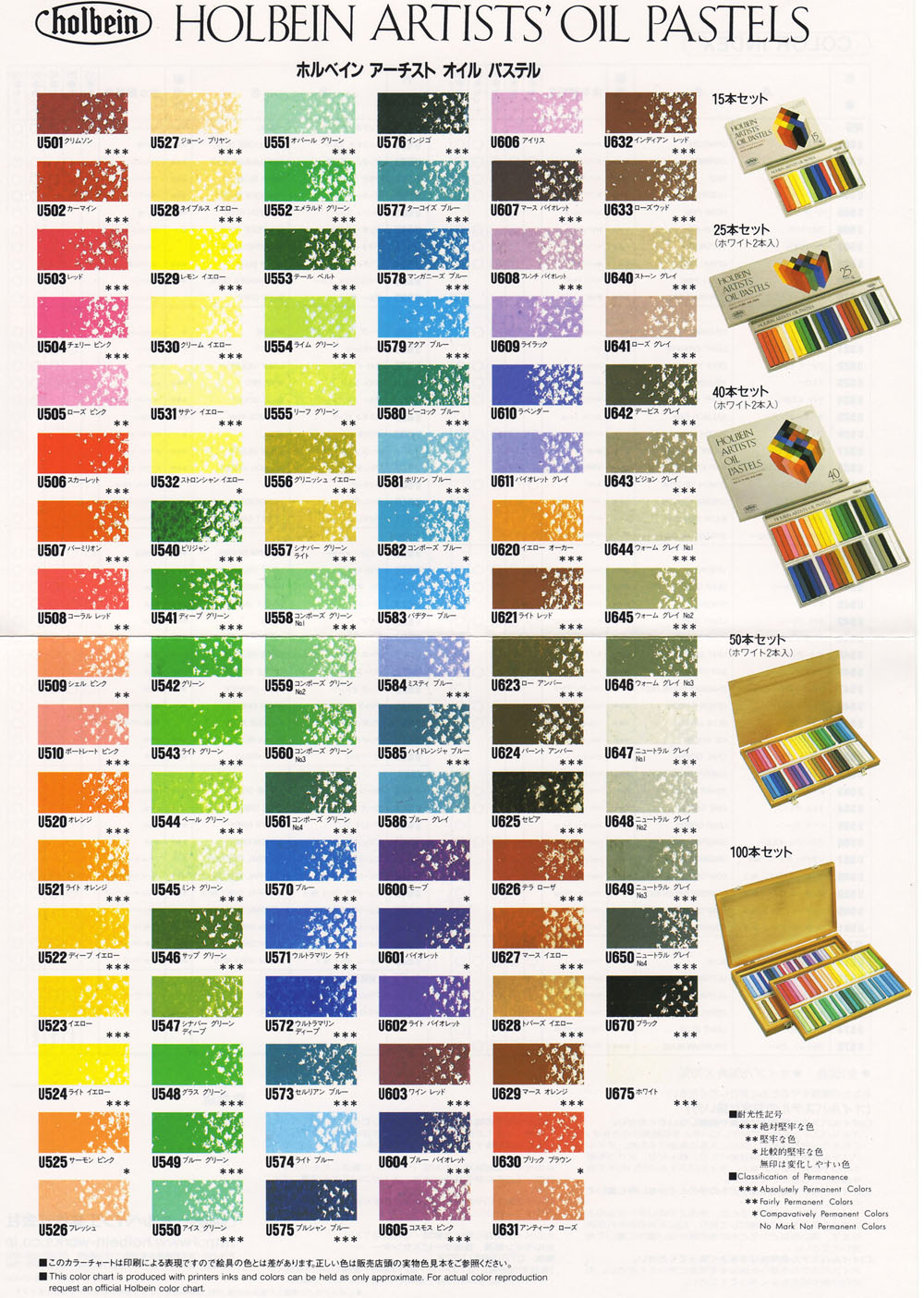 パステルは直接指で持って描くので、皮膚への影響や、指から口に入ったときの健康への影響が特に考慮されなければなりません。ホルベイン オイルパステルはこの点で有害な材料を 一切使っていないので、安心してお使いいただけます。