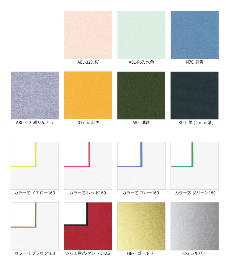 ABL-P67 紙(2mm厚)水色・ABL-852 紙(2mm厚)ストーンベージュ・ABL-328 紙(2mm厚)桜・ABL-913 紙(2mm厚)群青・ABL-512 紙(2mm厚)雅りんどう・ABL-582 紙(2mm厚)濃緑(旧オリーブ)・LB-N57 紙(2mm厚)山吹・HB-1 紙(2mm厚)ゴールド・HB-2 紙(2mm厚)シルバー・カラー芯 紙(1.5mm厚)ブルー160・カラー芯 紙(1.5mm厚)イエロー160・カラー芯 紙(1.5mm厚)グリーン160・カラー芯 紙(1.5mm厚)レッド160・カラー芯 紙(1.5mm厚)ブラウン160・B-753 紙(2mm厚)黒芯-タントD52赤