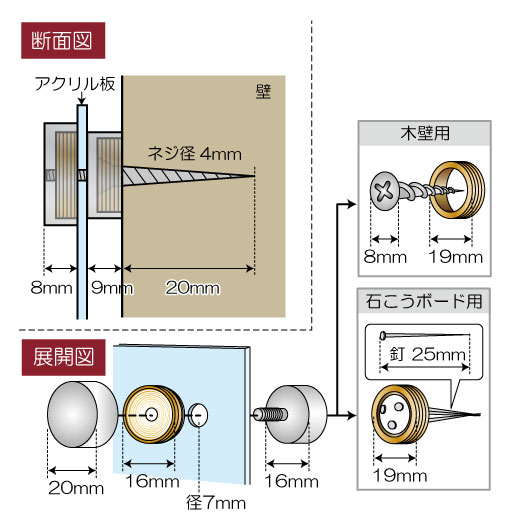 4コーナー金具付き 石膏ボード用と木壁用をお選び頂けます。 |