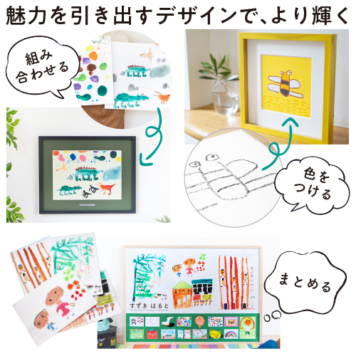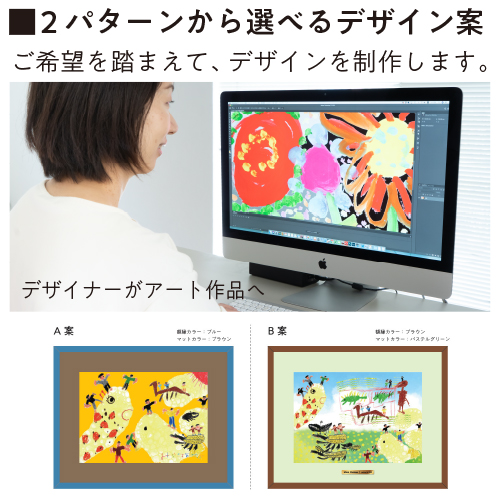 デザイナーとのコラボでよりアートな作品へ!たくさんの絵をまとめたり、お気に入りの絵を組み合わせたり。ご希望を踏まえてデザイン制作し、額縁カラーも含め2パターンご提案いたします。