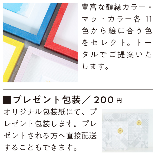 【ご希望の方は、ご注文時に備考欄にご記入ください。】 ①添えたい言葉を自由に ひらがな・カタカナ・漢字は20文字、英字なら30文字程度がきれいに入る目安です。 ②プレート付けサービス 絵に言葉を添えてぐっとおしゃれに。 名前や年齢、日付、作品名などお好きな文字列を彫刻できます。 (ひらがな・カタカナ・漢字は20文字、英字なら30文字程度まで) ③プレゼント包装 ※S・Mサイズ/200円、Lサイズ/300円 オリジナル包装紙にて、プレゼント包装します。 プレゼントされる方へ直接配送することもできます。 |