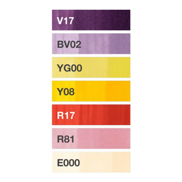 厳選されたセットカラー「どれみカラー」「おんぷカラー」など、実際に馬越氏が着彩に使用している色を7色厳選。作品の世界観にぴったりのカラーセットです。 |