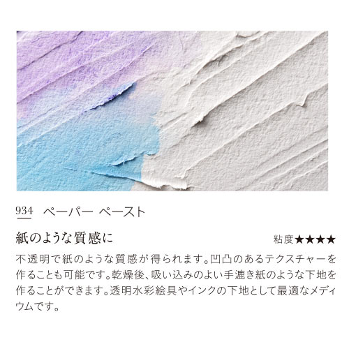 不透明で紙のような質感が得られます。凹凸のあるテクスチャーを作ることも可能です。乾燥後、吸い込みのよい手漉き紙のような下地を作ることができます。透明水彩絵具やインクの下地として最適なメディウムです。