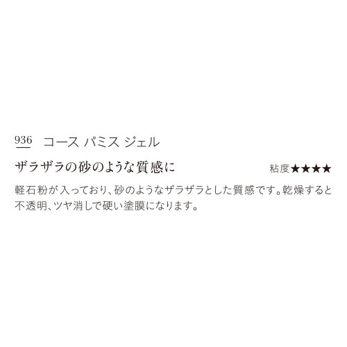 軽石粉が入っており、砂のようなザラザラとした質感です。乾燥すると不透明、ツヤ消しで硬い塗膜になります。