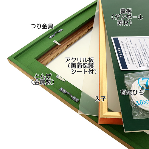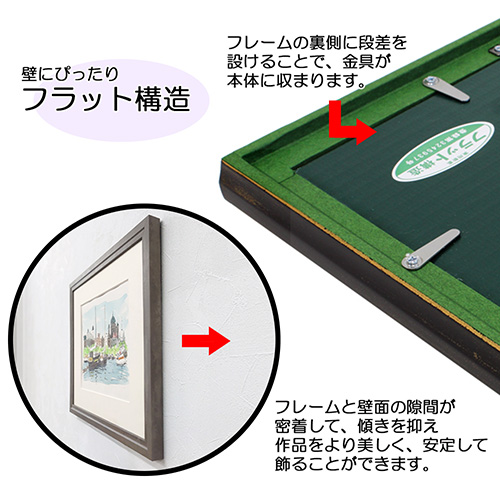 - 額縁の裏側に段差を付け、内側に止め具と吊り金具を取り付けた「フラット構造」で、
