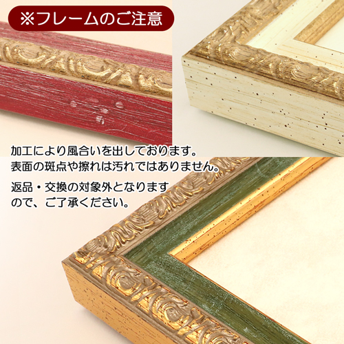 フレームの隅々にまで施された繊細な凹凸と、あえてかすれさせたような塗装が、アンティークのような「深み」を生み出す額縁です。