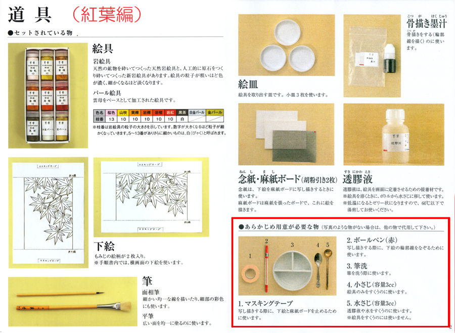 ・岩絵具 9色(桜色13、山吹10、黄樺10、岩樺10、岩橙10、岩紅10、黒茶白、白金パール、金パール)