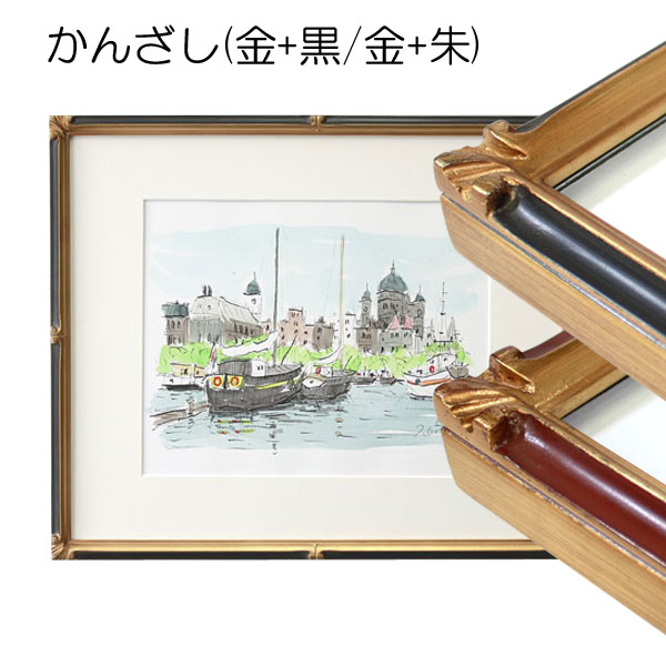(税込)「かんざし」は、細めのフレームで、コーナーの彫刻がおしゃれなアンティーク調の額縁です。色もツートンカラーで、高級感があります。幅広い作品に対応できます。質感高く額装できます!