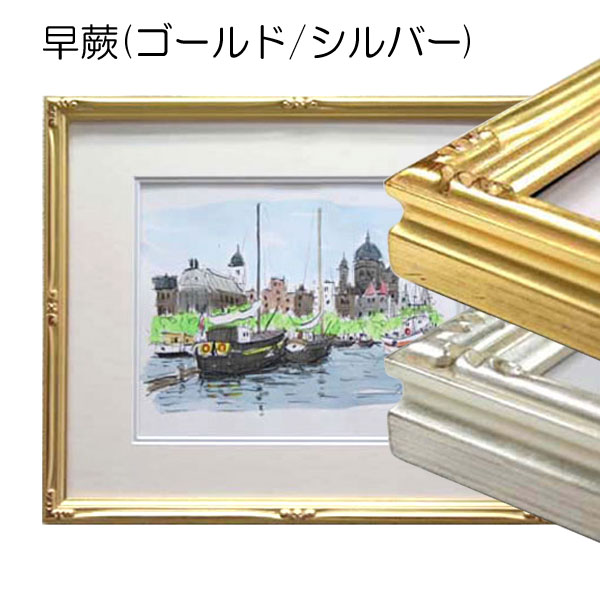 (税込)「早蕨」は、きらびやかなイメージの箔張りのシンプルなフレームです。コーナーの紋と、全体のバランスが整ったデッサン額縁です。水彩画、書道等の作品を高級感のある雰囲気に額装!