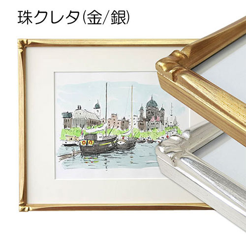 「珠クレタ」は、フレーム幅が16mmと細く全体として緩やかな湾曲したように見えるのが特徴的な額縁です。コーナーに紋の入ったおしゃれなデザインの額縁です。幅広い作品に対応でき高級感があります。